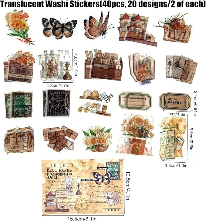 • Design: 40pcs washi stickers with 20 designs, 2 pieces of each; 40pcs decoupage papers with 20 designs , 2 pieces of each;20pcs PET transparent stickers with 10 designs,2 pieces of each.