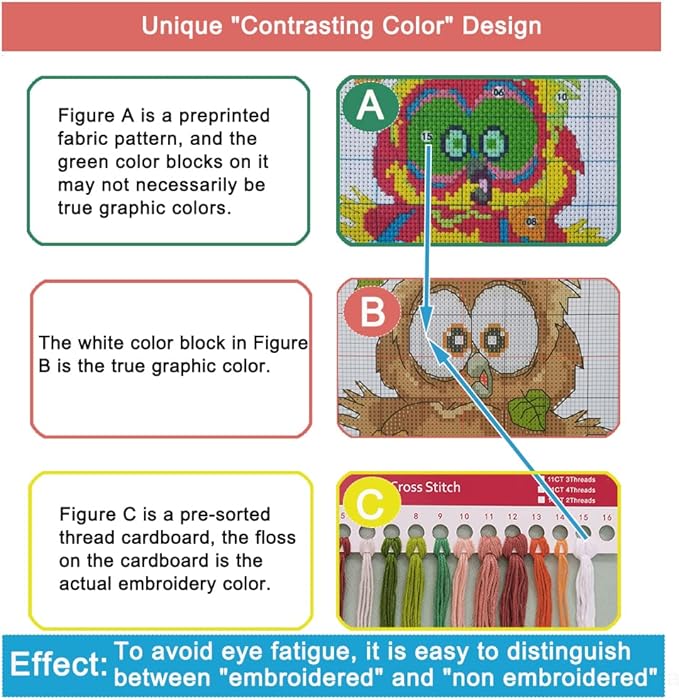 • 【Accurate HD Pre-printed and DMC Colors】The color patches on the print pattern are not the true colors of the floss. The symbols on the fabric have a corresponding number code. Just read the symbol, such as, "×""☆",and pick out the color the number code tells. Thus you can begin your stitch.