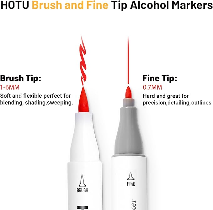 • FLEXIBLE BRUSH & FINE DOUBLE-TIP, DOUBLE THE EFFICIENCY: Widen your artistic horizons with the HOTU alcohol markers brush tip and fine tip! Our soft brush tip works well for brush calligraphy, sweeping strokes and large areas coloring, while the hard fine tip is perfect for precision drawing like simple outlines and little details. Also, our high quality Japenese nylon brush tip is flexible and reverisble, can applied to various drawing scenes, and no need to worry about durability