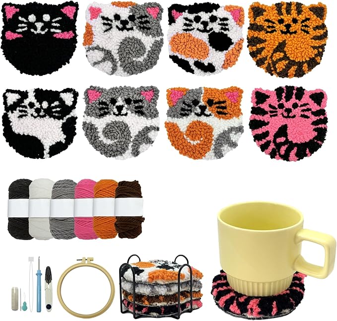 • Perfect Punch Needle Kits for Beginner - Our punching needle beginner kit is designed to be user-friendly and easy to operate, making it ideal for those new to punch needle crafting. It includes all necessary tools and instructions,videos to keep you hassle free for creating beautiful coaster designs.PACKAGE INCLUDES - Cloth with pattern x 8, enough wool yarns, punch needle tool x 1, embroidery hoop x 1, adhesive felt x 8, floss for hemming X 1, coaster holder x 1, instruction x 1.