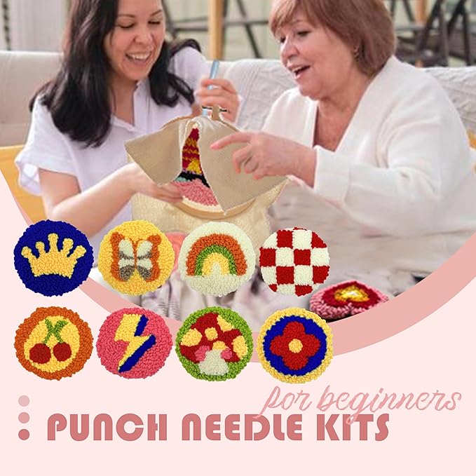 • Perfect Punch Needle Kits for Beginner - Our punching needle beginner kit is designed to be user-friendly and easy to operate, making it ideal for those new to punch needle crafting. It includes all necessary tools and instructions,videos to keep you hassle free for creating beautiful coaster designs.PACKAGE INCLUDES - Cloth with pattern x 8, enough wool yarns, punch needle tool x 1, embroidery hoop x 1, adhesive felt x 8, floss for hemming X 1, coaster holder x 1, instruction x 1.