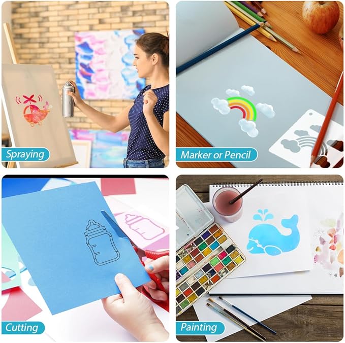 • 【Exquisite Design】:These stencils measure about 10 x 10 cm/ 4 x 4 inches,.The patterns of the stencils are designed in the shower theme, including giraffe, ducklings, bears, trojans, bottles, footprints, etc. Presented in a cute and warm style, adding a warm and lovely atmosphere to your creations, you will enjoy the fun of DIY projects.
