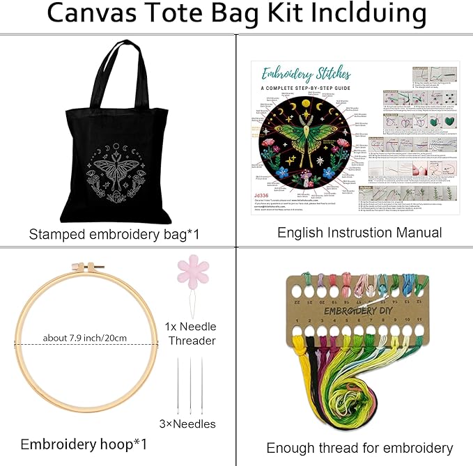 • Canvas tote bag embroidery kit include:Our embroidery kit includes 1 canvas bag , 1 needle threading devices,1 7.9inch embroidery hoop, an embroidery instruction, 2 embroidery needles and enough thread