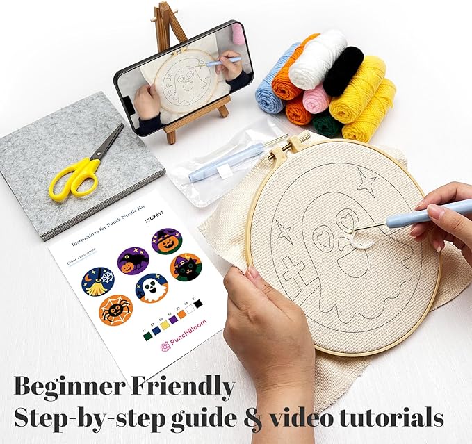 • [Complete DIY Craft Kit] This 6-piece punch needle beginners set includes pre-printed coasters, embroidery stitch yarn, punch needle, hoop, and step-by-step instructions—everything you need to start tufting adorable Halloween designs right out of the box. No extra tools required!
