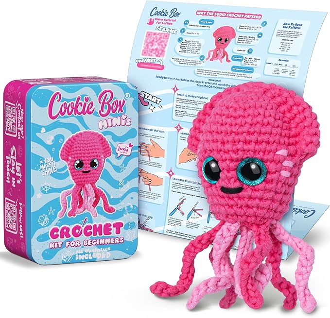 Cookie Box Crochet Kit for Beginners – Gift Set to Make Squid Inky Amigurumi Plushie – Easy DIY Crochet & Knitting Starter Kit with Printed Instructions & Step-by-Step Video Tutorial