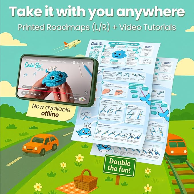 • πŸ—ΊοΈ Printed Crochet Road Map: You get two printed roadmaps β€” right-handed and left-handed β€” that teach you the basic crochet techniques and walk you step by step through the entire plush-making process.