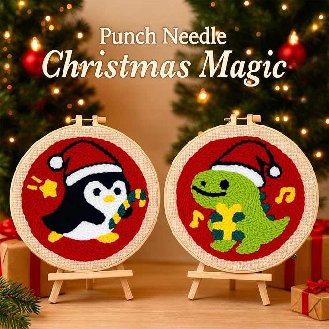 • Premium Punch Needle Kit for Beginners – This complete punch needle kit features two adorable Christmas designs (Dinosaur & Penguin), with pre-printed monk’s cloth, colorful yarn, embroidery hoops, a punch needle, and clear instructions—ready for easy, relaxing crafting.